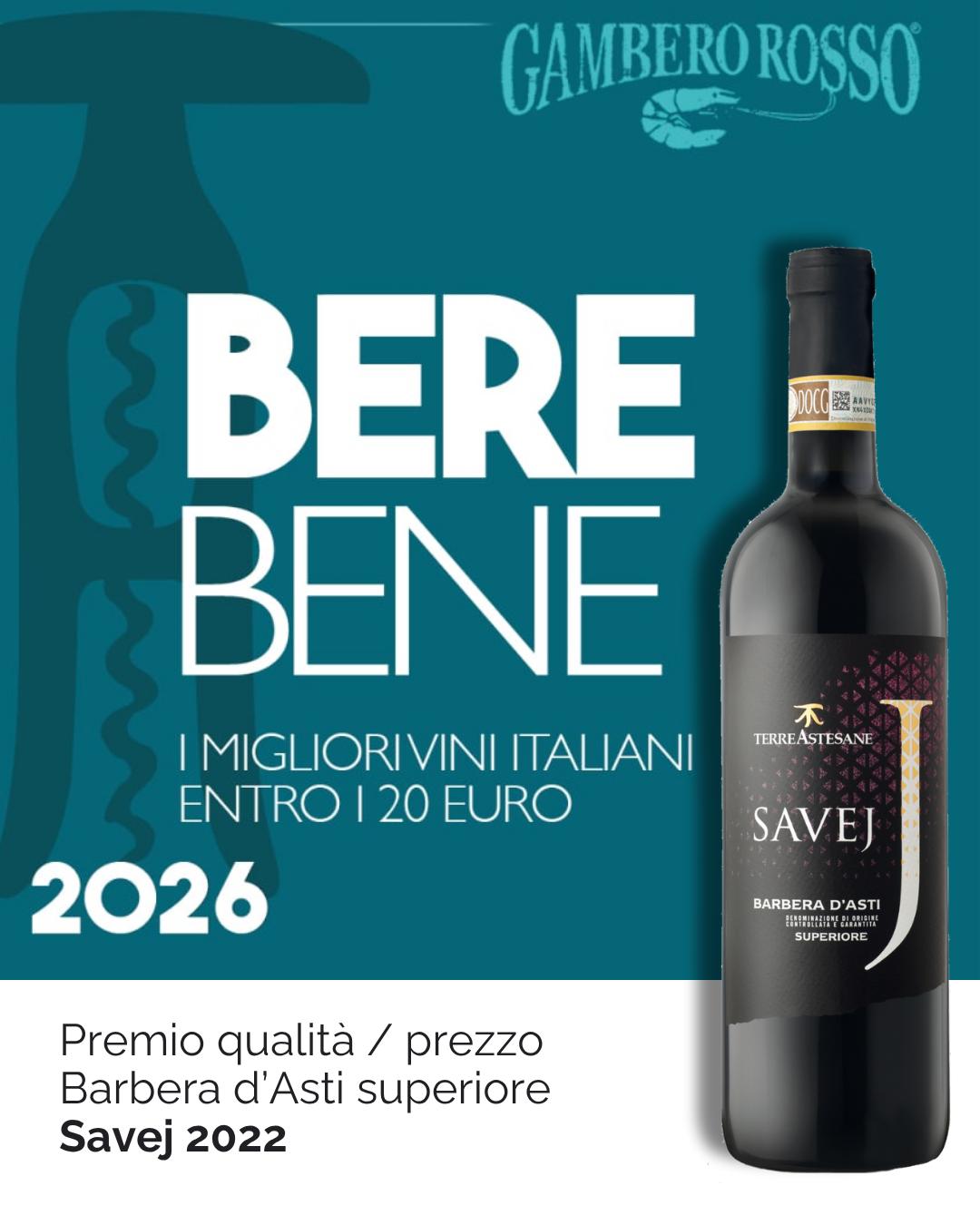 Siamo orgogliosi di annunciare che il nostro Savej Barbera d’Asti Superiore 2022 è stato premiato nella guida Berebene 2026 di Gambero Rosso, ricevendo il riconoscimento Qualità/Prezzo tra i migliori vini italiani entro i 20 euro.Questo importante premio rappresenta per noi una grande soddisfazione e una conferma del lavoro quotidiano che dedichiamo alla cura dei vigneti, alla qualità delle uve e al rispetto del territorio. Essere selezionati da Gambero Rosso, punto di riferimento del panorama enologico italiano, è uno stimolo a continuare con passione e coerenza il nostro percorso.